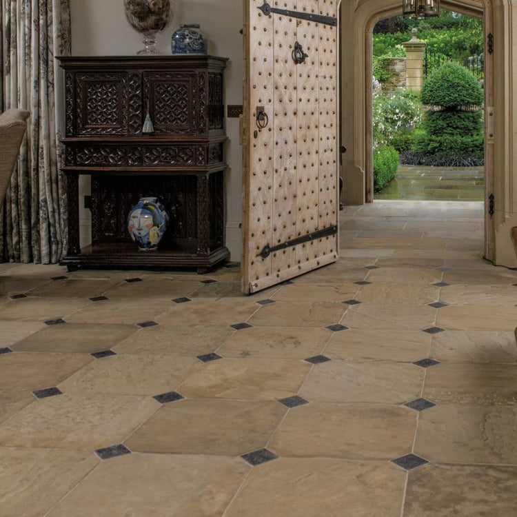 A standout feature is Lapicida’s reclaimed English flagstone flooring with striking deep red Rosso Levanto marble inserts; rich with character and steeped in history, the antique flagstone tiles echo old-world splendour, grounding the space in timeless elegance and complementing the striking new chandelier from Cox London above.