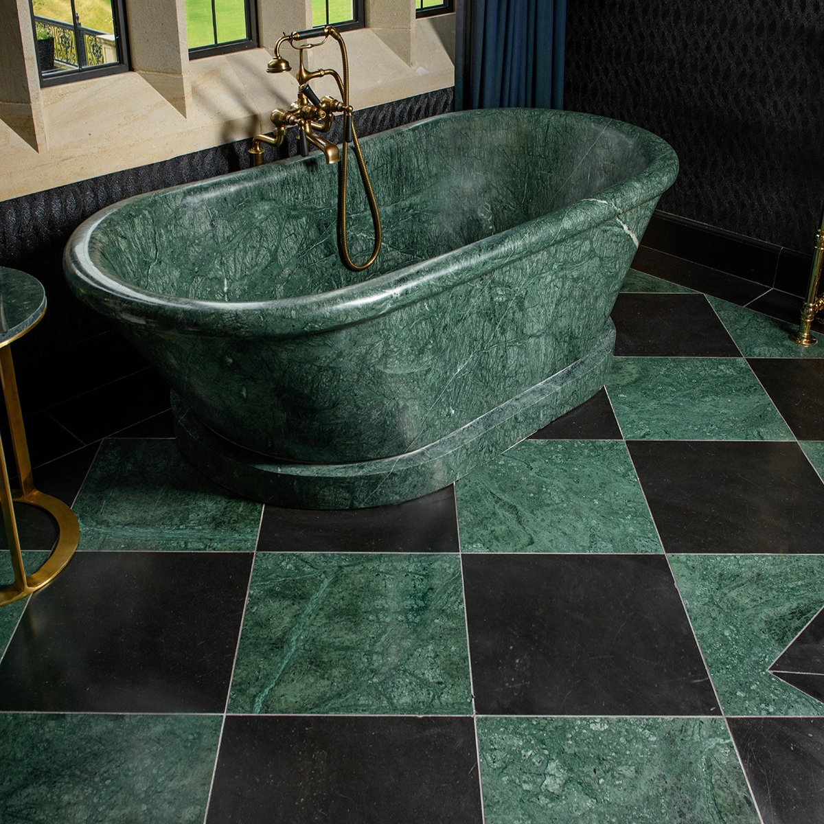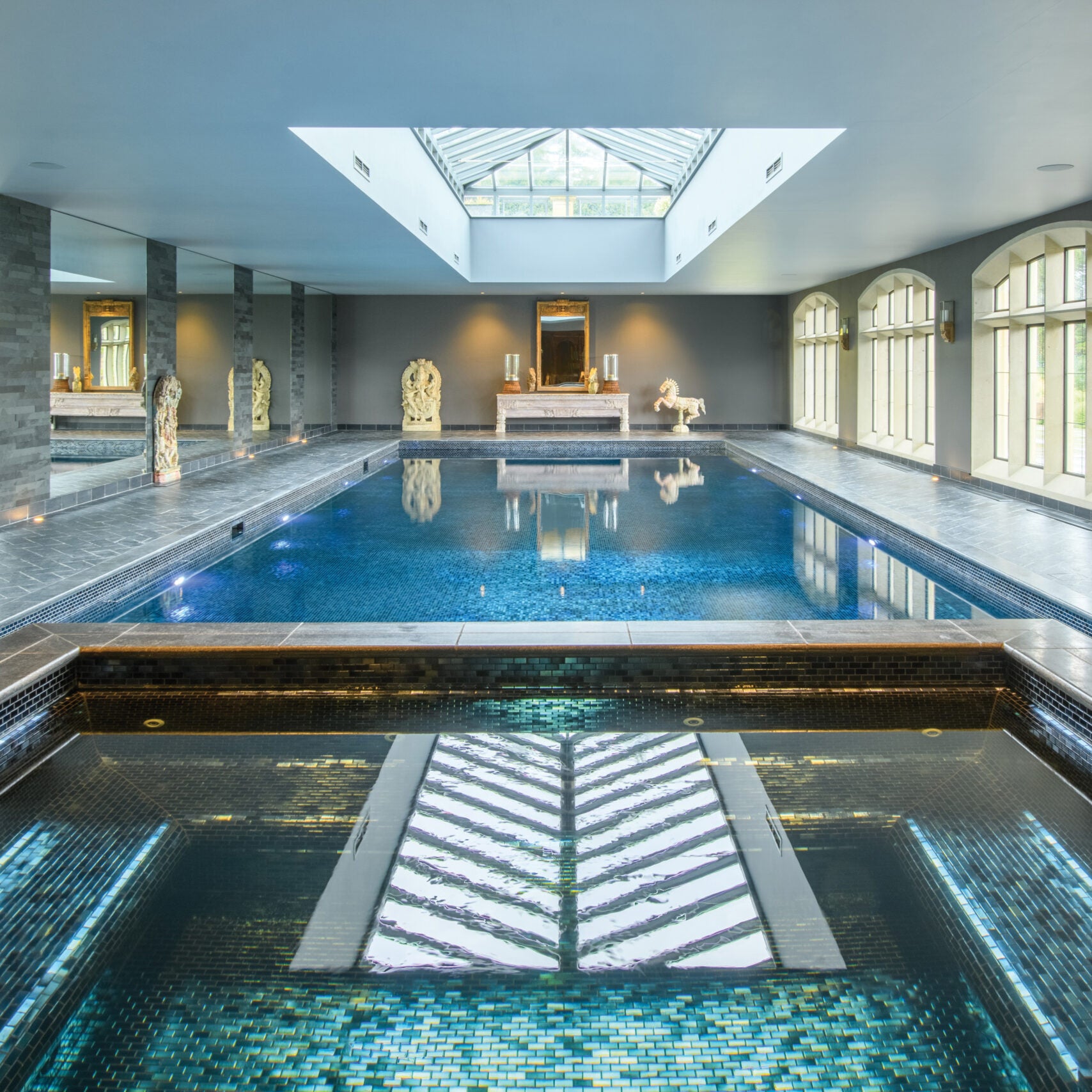 Everywhere you look at this amazing private residence, attention to detail and quality is second to none. Green features prominently in one bathroom where a bespoke Lapicida Roll Top Green Marble Bath keys perfectly with its green and black marble chequerboard floor. In the boot room, the racing green cabinetry is complimented by the Genuine Antique English Reclaimed Octagon sandstone floor. A real splash is also made with Lapicida surfaces used throughout the serene indoor pool.