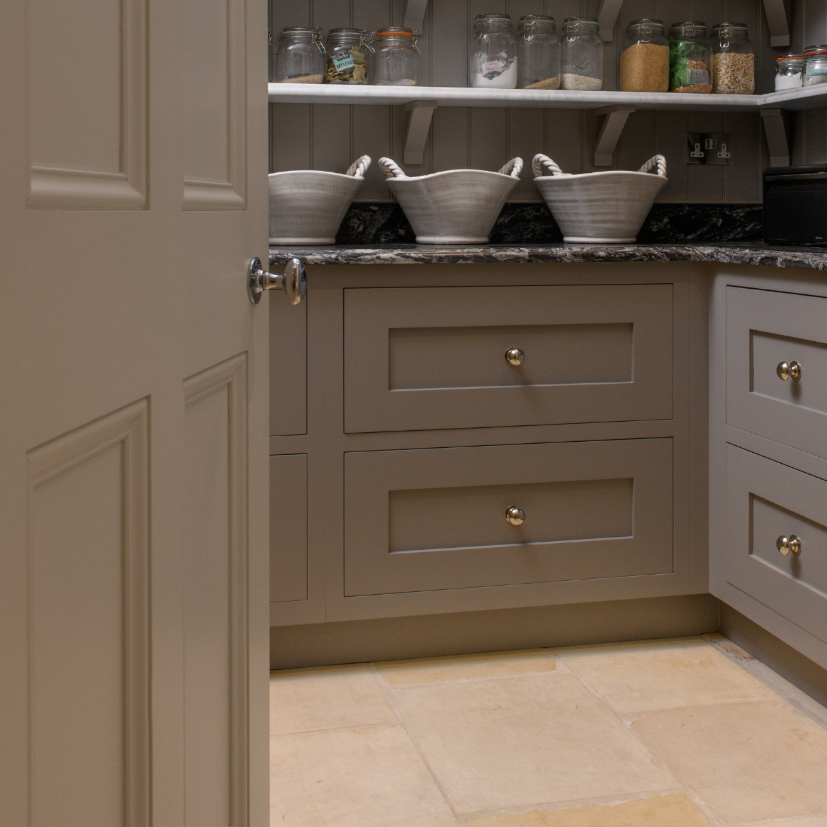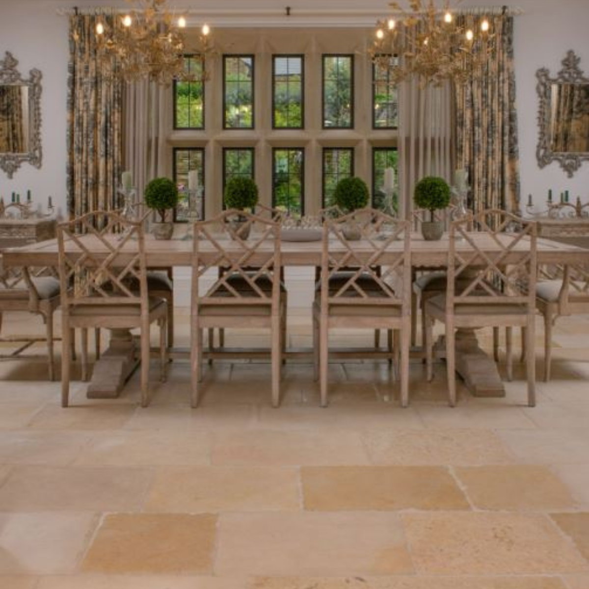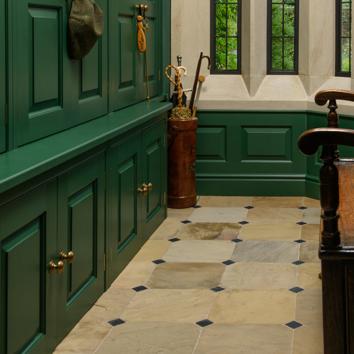 When you first enter the property, you cannot help but notice the floors. The client wanted to make an immediate impression in the entrance hall with an expanse of natural stone flooring that had a traditional, yet eye-catching, pattern. Together we selected our Genuine Antique English Reclaimed Octagon which has real charisma. Cut to shape by our craftsmen, they marry the finest English reclaimed sandstone flags with Reclaimed Belgian Blue cabochons. The mason’s edge adds true provenance and style to this original surface. Reclaimed flags were also selected for the wine cellar to add a rustic permanence and authenticity.