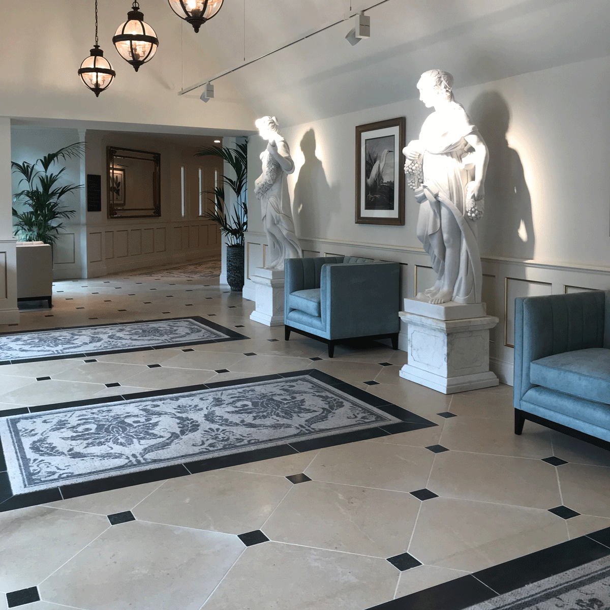 “Lapicida’s craftsmanship is evident throughout Grantley Hall. From the complex geometric marble and limestone floor in the entrance hall to the dramatically quarter-matched floor of the swimming pool and sumptuous marble bathrooms. The Jurassic marble floor featured in the Bar & Restaurant EightyEight is remarkable and always a talking point.” Tracey Ractliffe, Director of Sales & Marketing, Grantley Hall