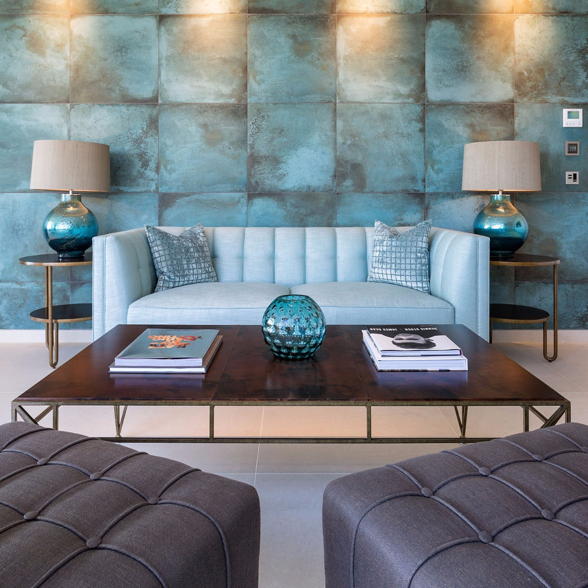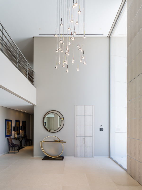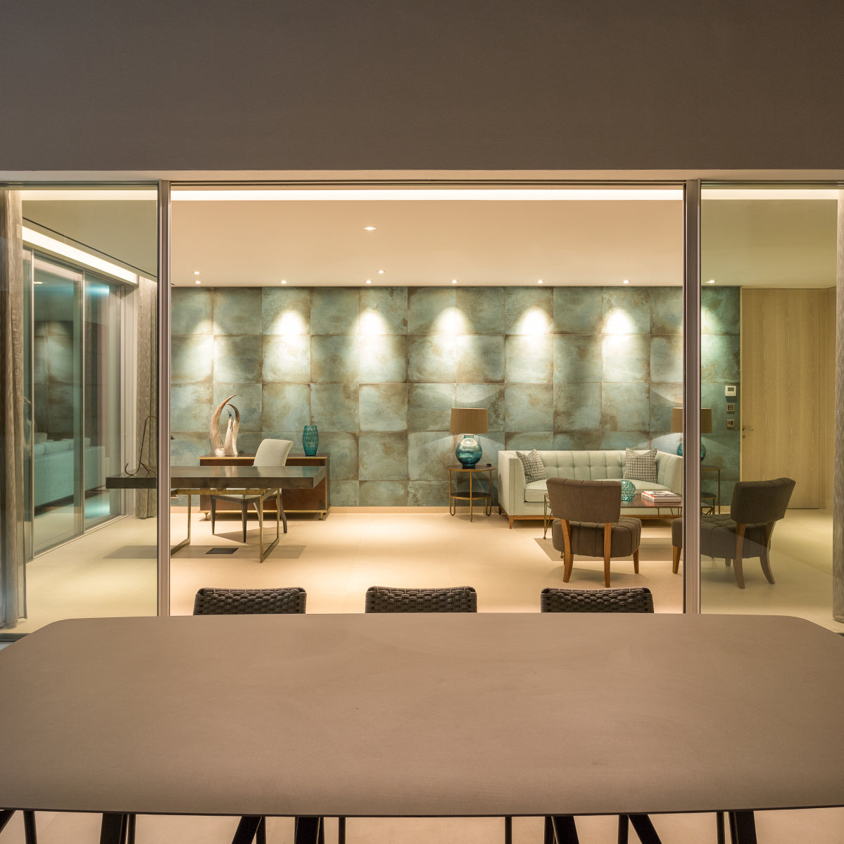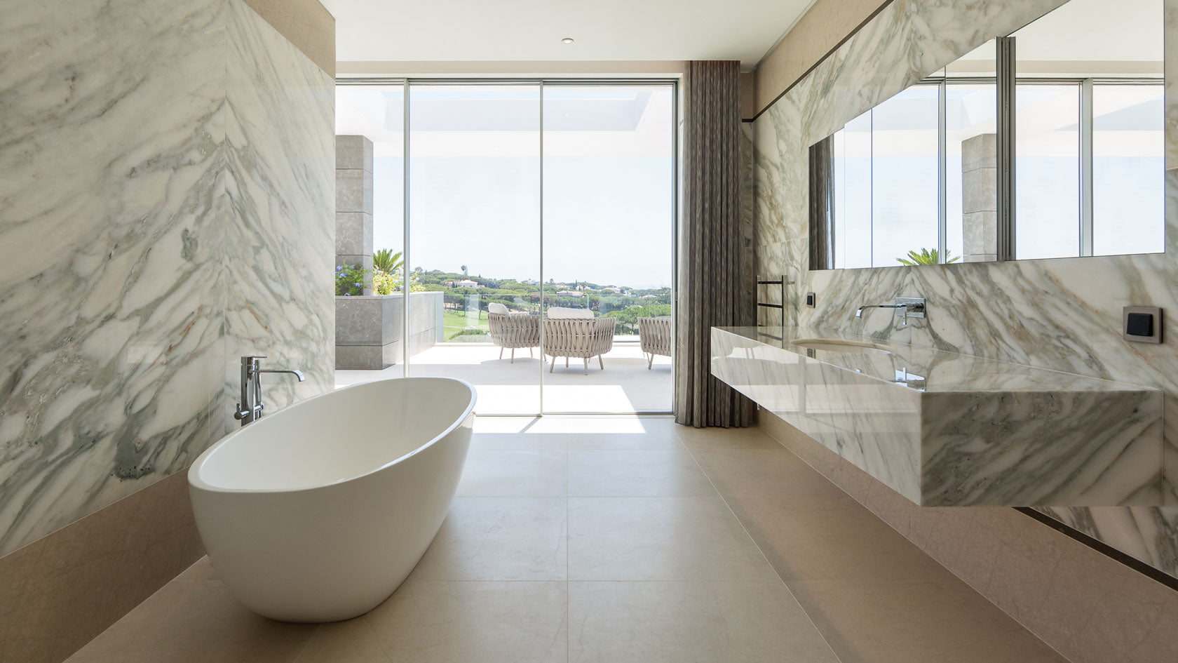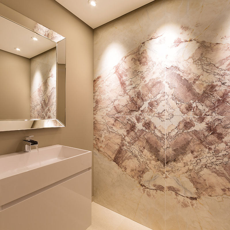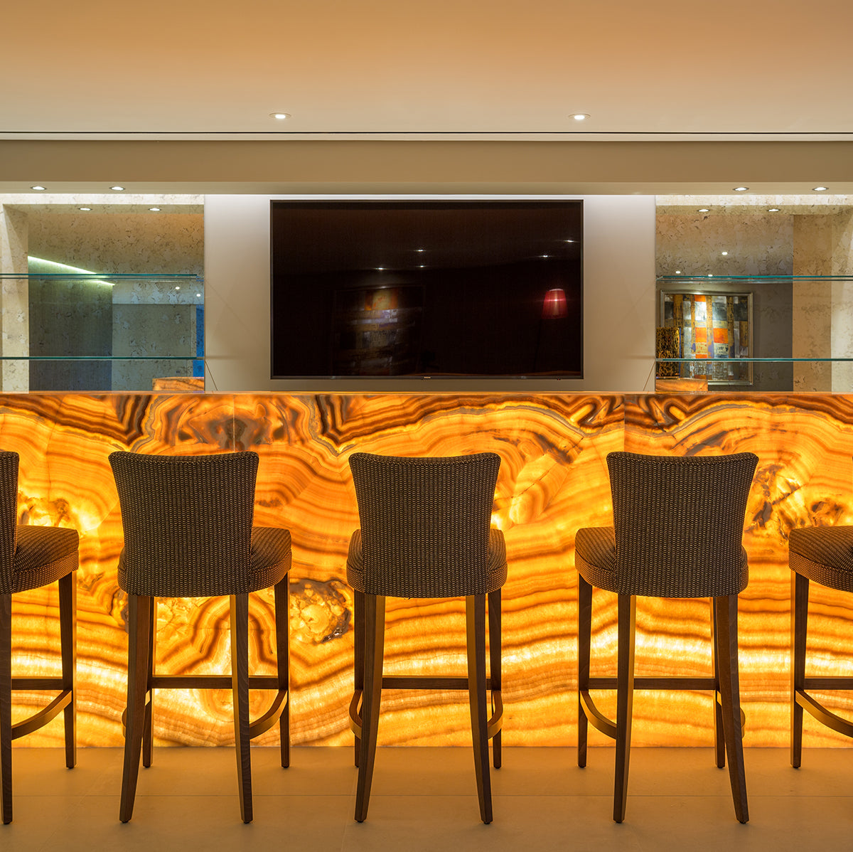 Stunning marble and travertine feature walls have been created throughout, sitting alongside limestone flooring and cladding. A rare bookmatched marble has been used in the bathrooms and Brazilian Copper Dune quartzite and Onyx Miele in the kitchen and bar areas.